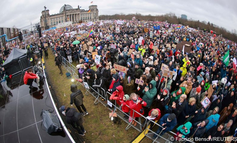 وتشهد ألمانيا منذ أكثر من ثلاثة أسابيع خروج عشرات آلاف الأشخاص إلى الشوارع للتنديد بالتطرف اليميني وبحزب البديل من أجل ألمانيا، وذلك بعد أن كشفت منصة “كوريكتيف” الإعلامية عن اجتماع عقده يمينيون متشددون مع ساسة من حزب البديل والحزب المسيحي الديمقراطي وجمعية “فيرته أونيون”/اتحاد القيم/ في مدينة بوتسدام في تشرين الثاني/نوفمبر لمناقشة “إعادة تهجير” عدد كبير من الأشخاص المنحدرين من أصول أجنبية بما في ذلك من يحمل الجنسية الألمانية؛ وجرت العادة أن يستخدم المتطرفون اليمينيون هذا المصطلح كوصف مخفف لإجبار هؤلاء الأشخاص على الرحيل عن ألمانيا.
