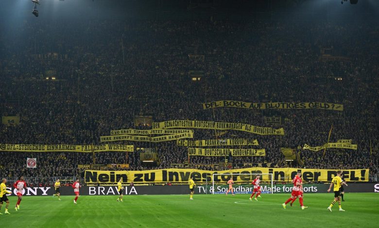 وتحتج الجماهير على خطط رابطة الدوري الألماني لكرة القدم لجلب شريك استراتيجي من خلال رمي كرات التنس وقطع الشوكولاتة في شكل عملات معدنية وأشياء أخرى على أرض الملعب.
