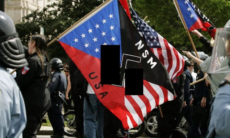 في وضح النهار وفي قلب الولايات المتحدة الأمريكية خرج العشرات في عرض للنازيين الجدد في فيديو توثيقي في مدينة ناشفيل بولاية تينيسي، وخرج العشرات من أعضاء منظمة النازيين الجدد “قبيلة الدم” ملثمي الوجوه ويرتودون زيا أسود واحمر ورفعوا رايات تحمل صلبانا معقوفة وأدوا التحية بأيد مرفوعة أمس السبت.