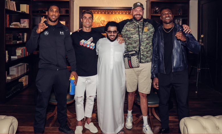 ونشر تركي آل الشيخ، عبر حسابه على منصة “إكس” (تويتر سابقاً)، صورة تجمعه مع لاعب نادي النصر السعودي، رونالدو، والملاكم البريطاني أنتوني جوشوا ومواطنه تايسون فيوري، ومقاتل فنون قتال مختلطة الفرنسي فرانسيس نغانو.