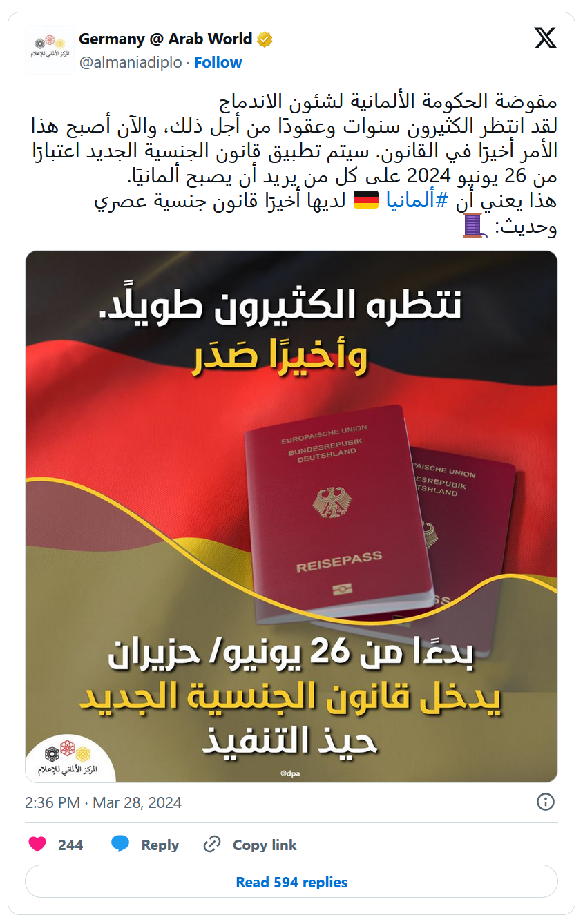 وجاء في المنشور الذي تم نشره نهاية شهر مارس / آذار المنصرم على صفحة المركز الألماني للإعلام التابع لوزارة الخارجية الألمانية، عبارة على لسان مفوضة الحكومة الألمانية لشئون الاندماج” تقول “انتظره الكثيرون كثيراً وأخيراً صدر.. بدءأ من 26 يونيو/ حزيران يدخل قانون الجنسية الجديد حيز التنفيذ”. لكنه تضمن أخطاء كثيرة باللغة العربية، إضافة إلى أخطاء واضحة في الكتابة على صورة جواز السفر الألماني، مما أثار سخط متفاعلين كثر من العرب والألمان على حد سواء.