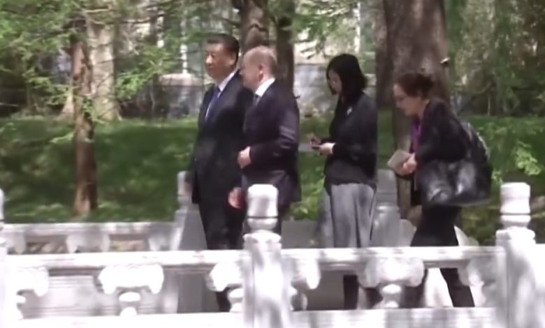 الرئيس الصيني يصطحب المستشار الألماني في جولة بدار الضيافة في بكين ( فيديو )