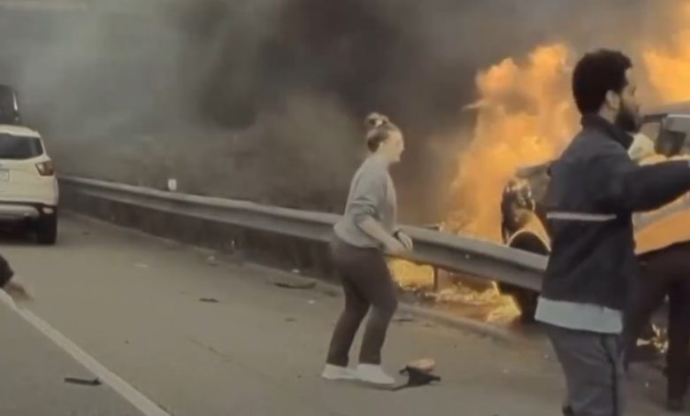 في مشهد بطولي .. متطوعون ينقذون رجلاً كادت أن تلتهمه النيران على طريق سريع ( فيديو )