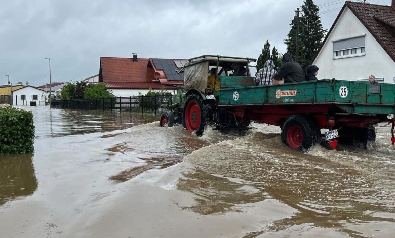 ضربت عواصف مطيرة أجزاء شاسعة من جنوبي ألمانيا أمس الجمعة والسبت، مما تسبب في فيضانات عارمة وانقطاعات كبيرة لخطوط المواصلات وجرت عمليات لإجلاء السكان بمروحية من إحدى بلدات غرب ميونخ.
