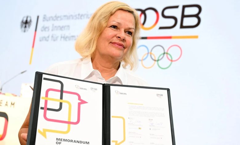 وخلال وجودها بالعاصمة الفرنسية باريس، التي تستضيف حالياً أولمبياد 2024، وقعت وزيرة الداخلية والرياضة في ألمانيا نانسي فيزر اتفاقية أساسية مع الاتحاد الألماني للرياضات الأولمبية، والولايات الاتحادية والمدن المهتمة بتقديم عرض لتنظيم الدورة الأولمبية.