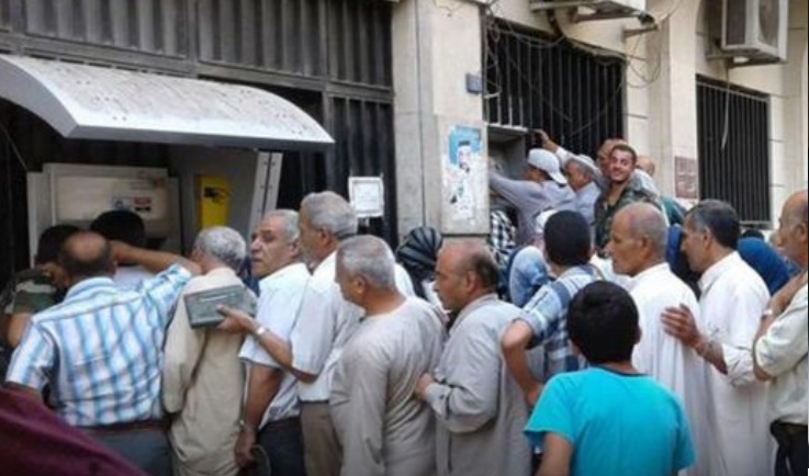 اشتكى موظفون حكوميون ومتقاعدون بمناطق سيطرة النظام، من صعوبة سحب رواتبهم الشهرية من أجهزة الصراف الآلي، حيث ينتظرون ضمن طابور طويل ساعات عدة شهرياً، ومن الممكن ألا يحصلوا على المال من جراء نفاده من الصراف.