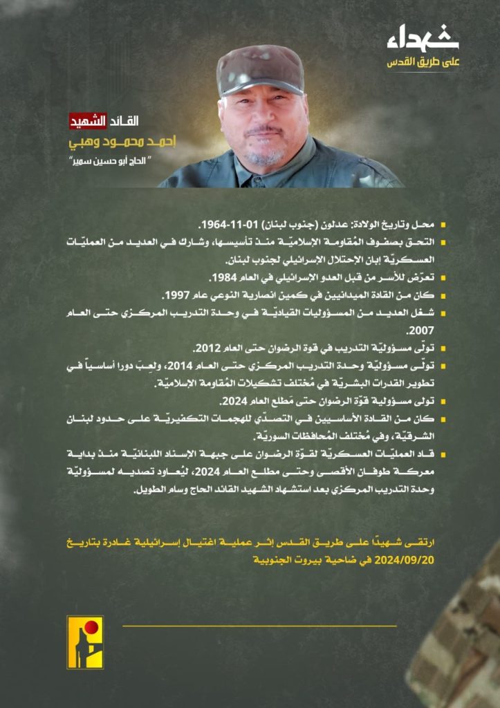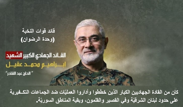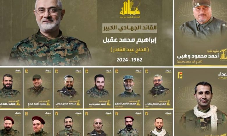 حزب الله من جهته أكد في وقت متأخر من ليلة الجمعة السبت اغتيال عقيل وقال في بيان نعيه إن “القائد العسكري الكبير الحاج إبراهيم عقيل (الحاج عبد القادر) التحق بموكب إخوانه من القادة الشهداء الكبار بعد عمر حافل بالجهاد والعمل والجراح والتضحيات” بحسب تعبير البيان.