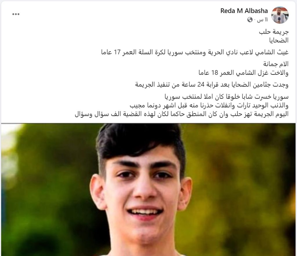 وذكر الإعلام الموالي أن غيث الشامي (17 عاماً)، اللاعب في نادي الحرية وفي المنتخب، وجد مع والدته جمانة وشقيقته غزل (18 عاماً) بعد 24 ساعة من وقوع الجريمة.