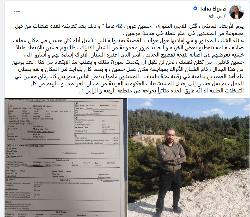 وقال الناشط الحقوقي السوري طه الغازي، إن حسين عزوز (42 عاماً) قتل بعد تعرضه لعدة طعنات من قبل مجموعة من المعتدين.