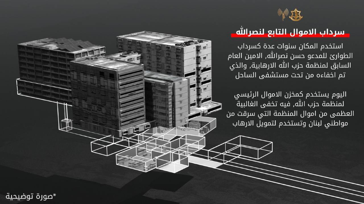 أعلن الجيش الإسرائيلي يوم الاثنين أن حزب الله يحتفظ بمئات الملايين من الدولارات بالعملات الورقية والذهب تحت مستشفى الساحل في منطقة حارة حريك ببيروت لاستخدامها في تمويل أنشطته.