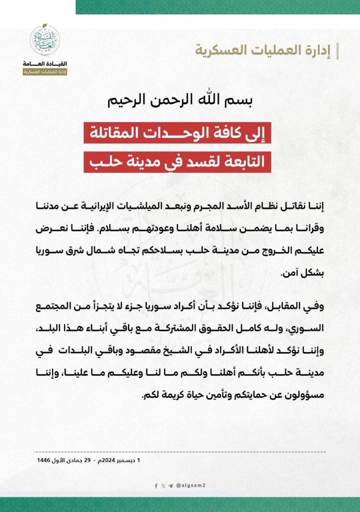 أعلنت إدارة العمليات العسكرية التي تقود عملية “ردع العدوان” التي سيطرت على حلب، في بيانٍ رسمي، عن تقديم عرض لوحدات قسد في المدينة، يدعوهم إلى الخروج من المدينة بأسلحتهم بشكل آمن، مشددةً على أن الهدف الأساسي هو ضمان سلامة المدنيين وعودتهم بسلام.