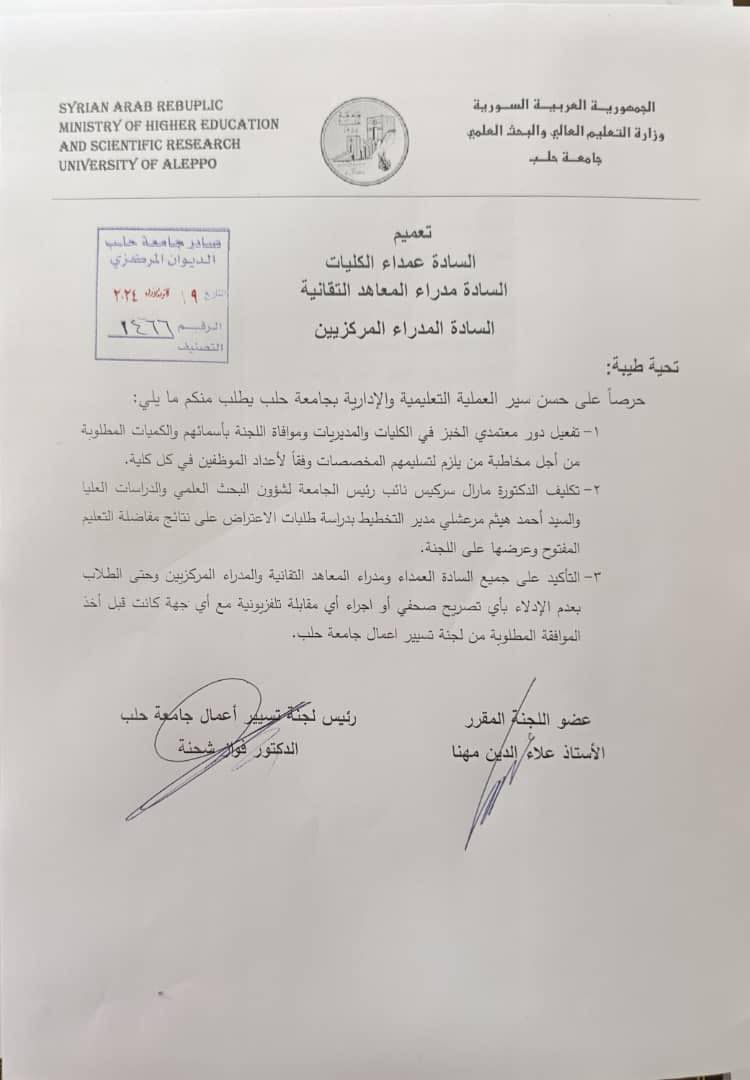 وجاء في القرار الصادر بتاريخ اليوم، الخميس 19-12، أنه يجب على جميع “العمداء ومدراء المعاهد التقانية والمدراء المركزيين وحتى الطلاب عدم الإدلاء بأي بأي تصريح صحفي أو إجراء أي مقابلة تلفزيونية مع أي جهة كانت قبل أخذ الموافقة المطلوبة من لجنة تسيير أعمال جامعة حلب”.