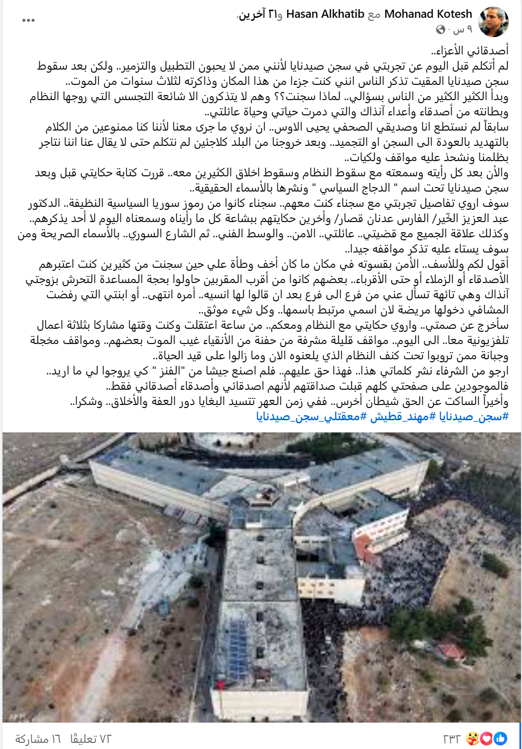 والأن بعد كل رأيته وسمعته مع سقوط النظام وسقوط اخلاق الكثيرين معه.. قررت كتابة حكايتي قبل وبعد سجن صيدنايا تحت اسم ” الدجاج السياسي ” ونشرها بالأسماء الحقيقية..