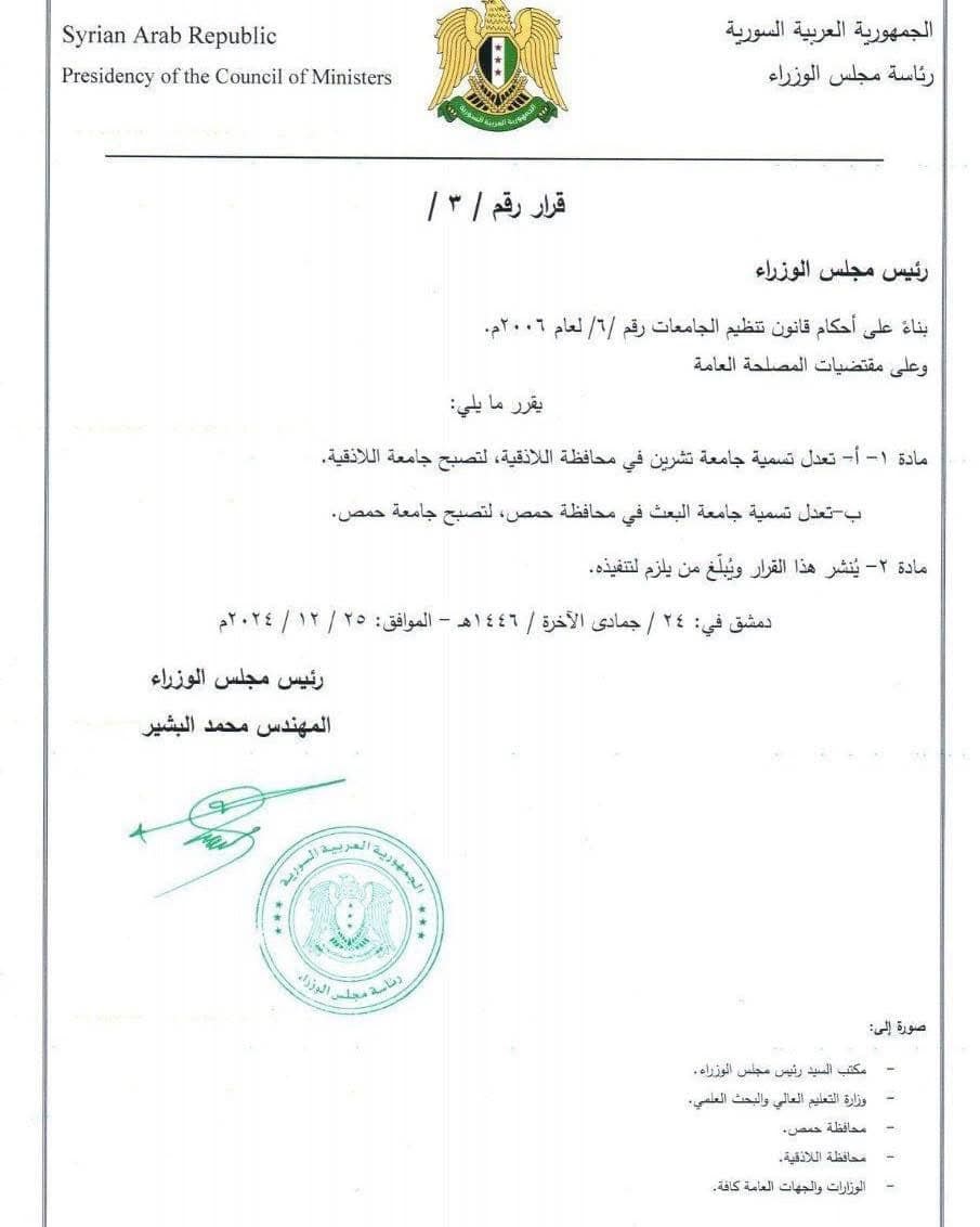 قرار من رئاسة " حكومة تصريف الأعمال " بتغيير اسمي جامعتي تشرين و البعث