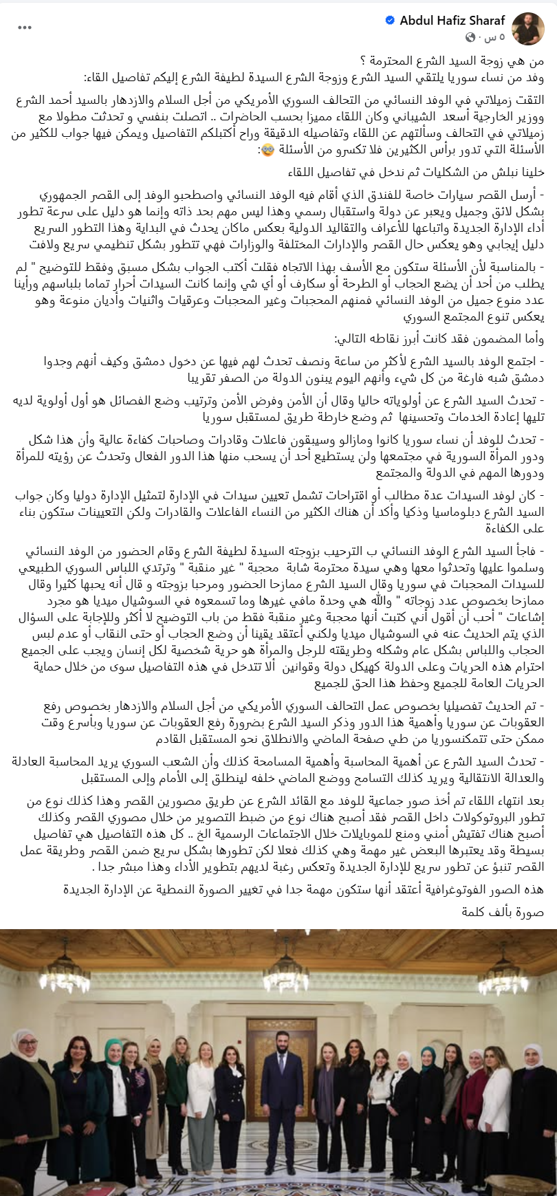 وقال شرف: “فاجأ السيد الشرع الوفد النسائي بالترحيب بزوجته السيدة لطيفة الشرع وقام الحضور من الوفد النسائي وسلموا عليها وتحدثوا معها وهي سيدة محترمة شابة محجبة غير منقبة وترتدي اللباس السوري الطبيعي للسيدات المحجبات في سوريا”.