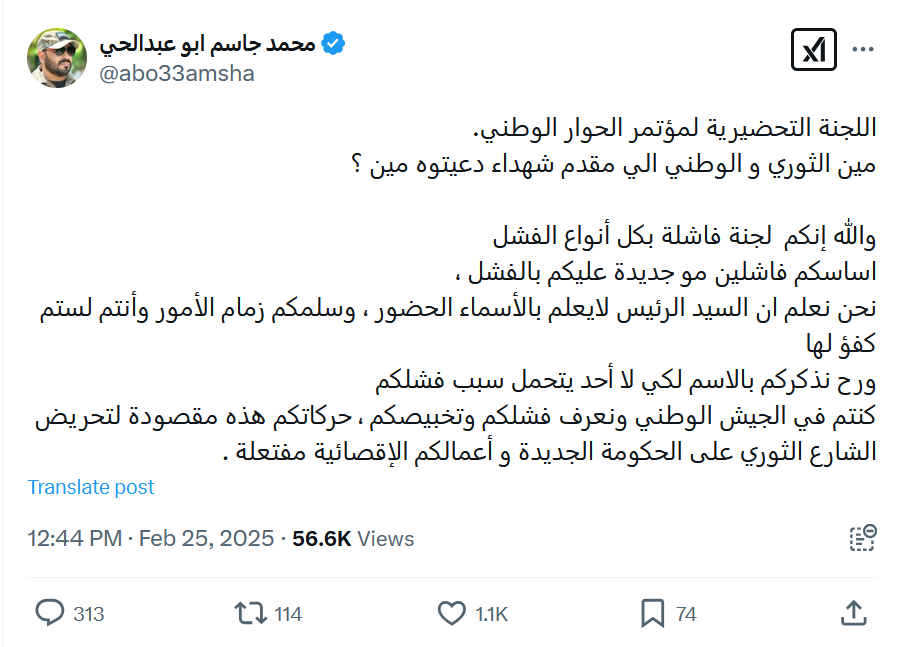 وقال أبو عمشة في تغريدة عبر حسابه في تويتر: “اللجنة التحضيرية لمؤتمر الحوار الوطني. مين الثوري و الوطني الي مقدم شهداء دعيتوه مين ؟ والله إنكم لجنة فاشلة بكل أنواع الفشل اساسكم فاشلين مو جديدة عليكم بالفشل، نحن نعلم ان السيد الرئيس لايعلم بالأسماء الحضور ، وسلمكم زمام الأمور وأنتم لستم كفؤ لها ورح نذكركم بالاسم لكي لا أحد يتحمل سبب فشلكم كنتم في الجيش الوطني ونعرف فشلكم وتخبيصكم ، حركاتكم هذه مقصودة لتحريض الشارع الثوري على الحكومة الجديدة و أعمالكم الإقصائية مفتعلة”.