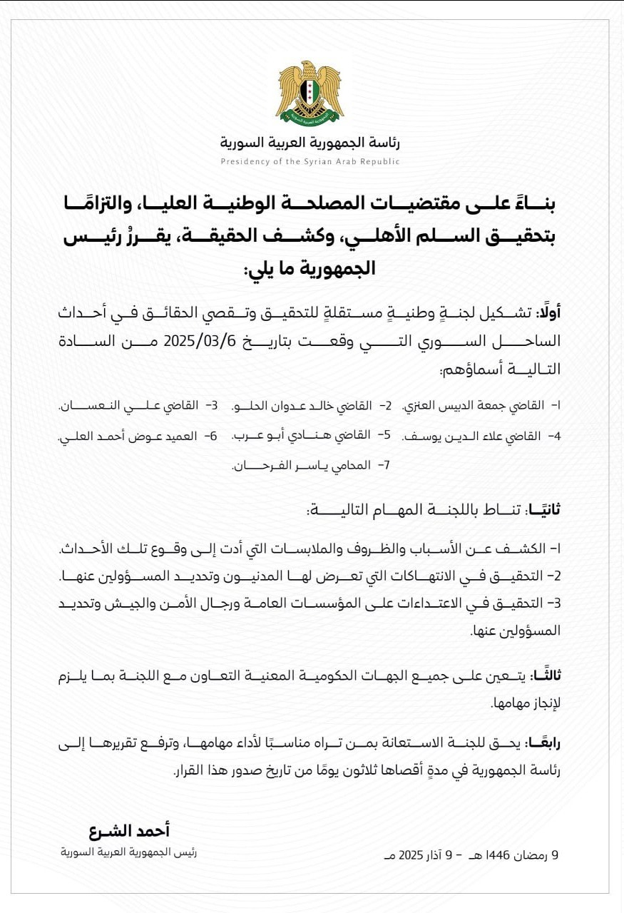 الشرع يعلن تشكيل لجنة تحقيق في الانتهاكات التي تعرض لها مدنيون في الساحل و تحديد المسؤولين عنها