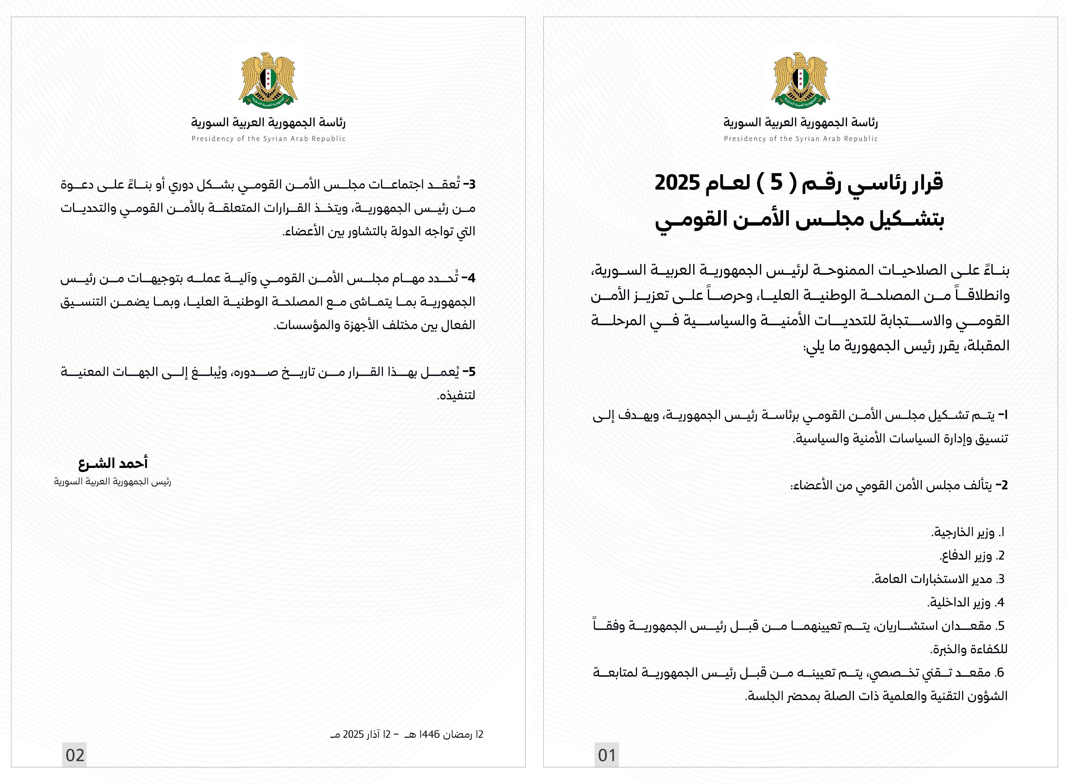 الشرع يعلن عن تشكيل مجلس الأمن القومي