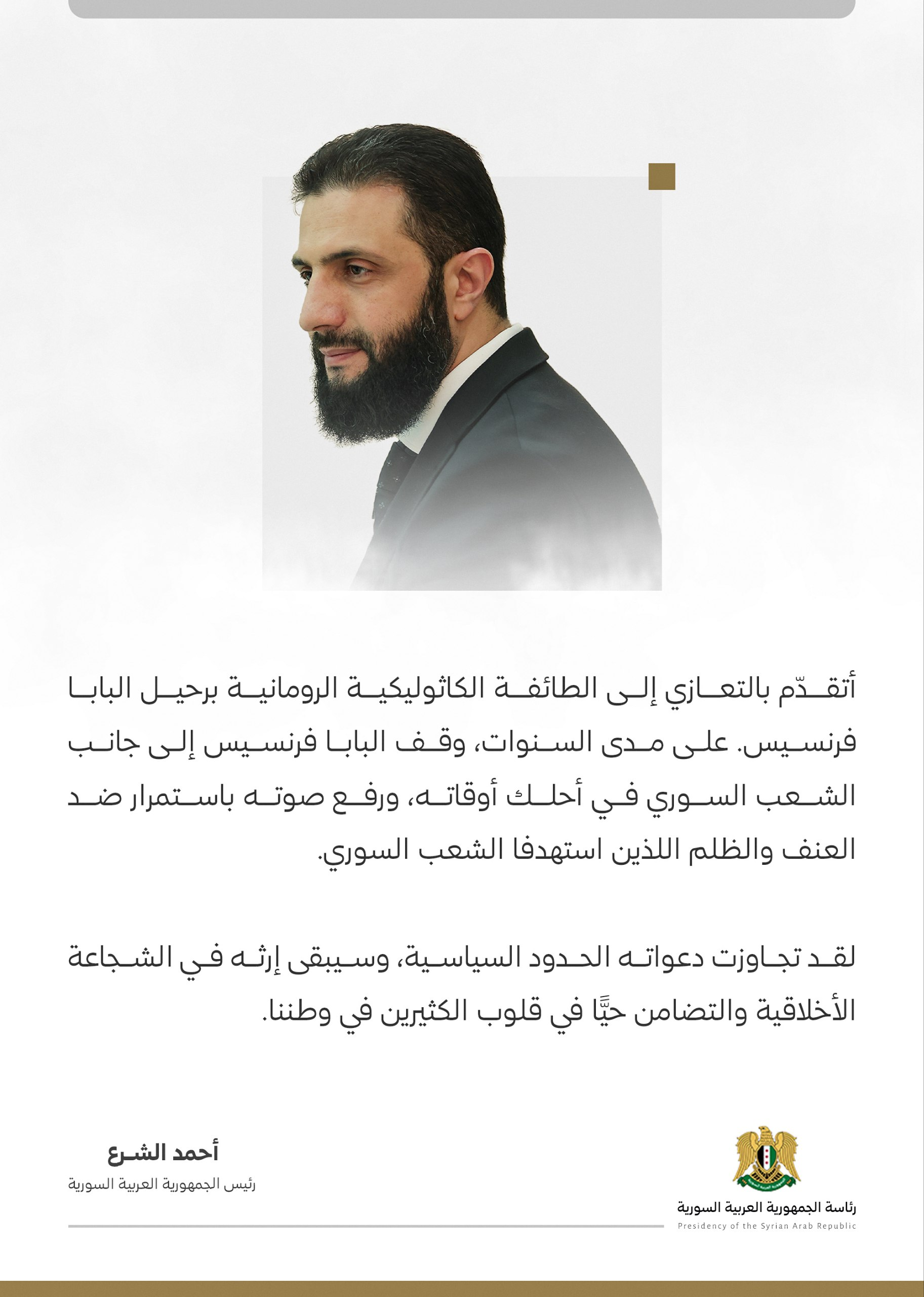 الشرع يعزي الطائفة الكاثوليكية برحيل البابا فرانسيس