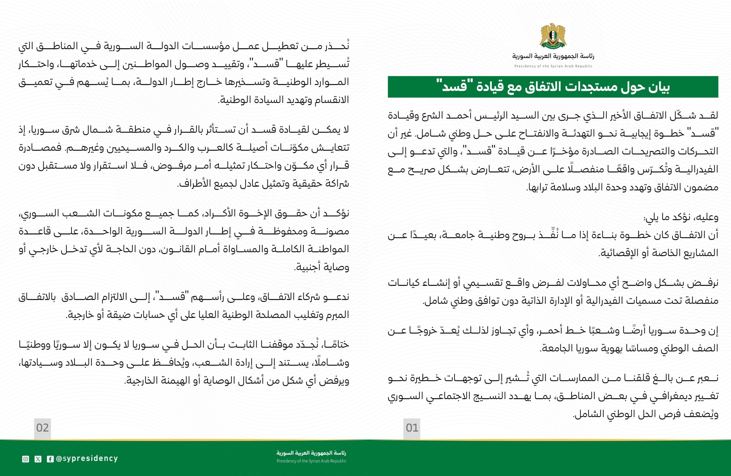 وذكر البيان أن الاتفاق الأخير الذي جرى بين الرئيس أحمد شرع وقيادة قسد “خطوة إيجابية نحو التهدئة والانفتاح على حل وطني شامل”.