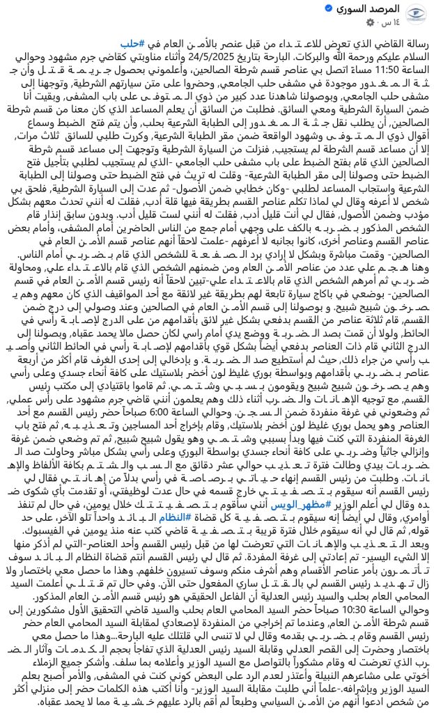 ويوم أمس، أفادت مصادر موثوقة للمرصد السوري لحقوق الإنسان بأن عناصر من جهاز الأمن العام التابع لجامعة حلب أقدموا على الاعتداء بالضرب المبرح على قاضي التحقيق في مدينة حلب، أحمد حسكل، وذلك أثناء قيامه بمهامه الرسمية في الانتقال للكشف على إحدى الجرائم المشهودة ضمن نطاق عمله القضائي.