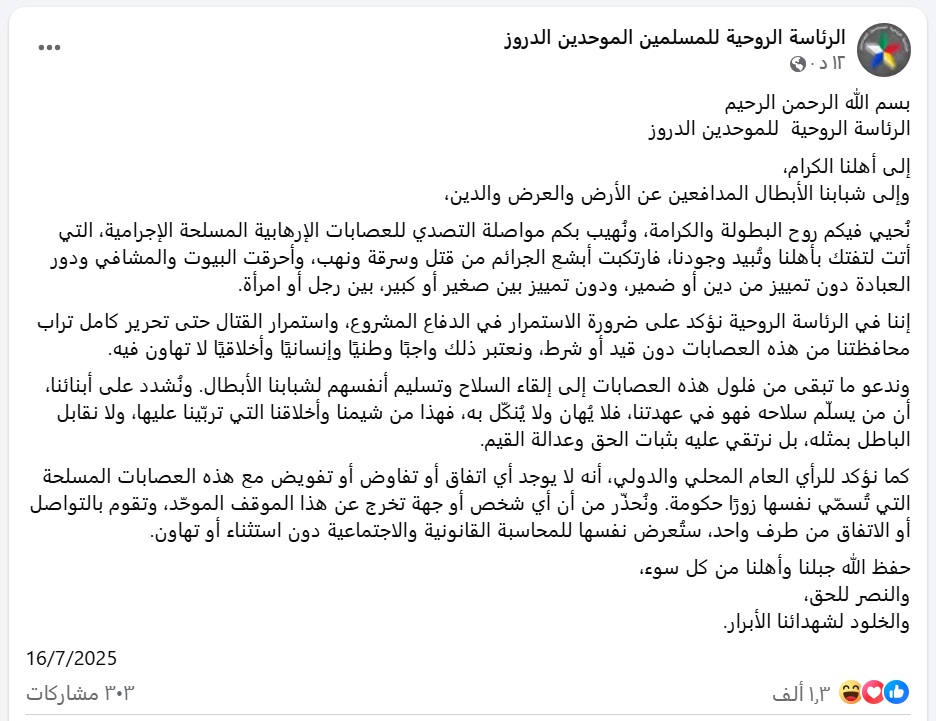 إننا في الرئاسة الروحية نؤكد على ضرورة الاستمرار في الدفاع المشروع، واستمرار القتال حتى تحرير كامل تراب محافظتنا من هذه العصابات دون قيد أو شرط، ونعتبر ذلك واجبًا وطنيًا وإنسانيًا وأخلاقيًا لا تهاون فيه.