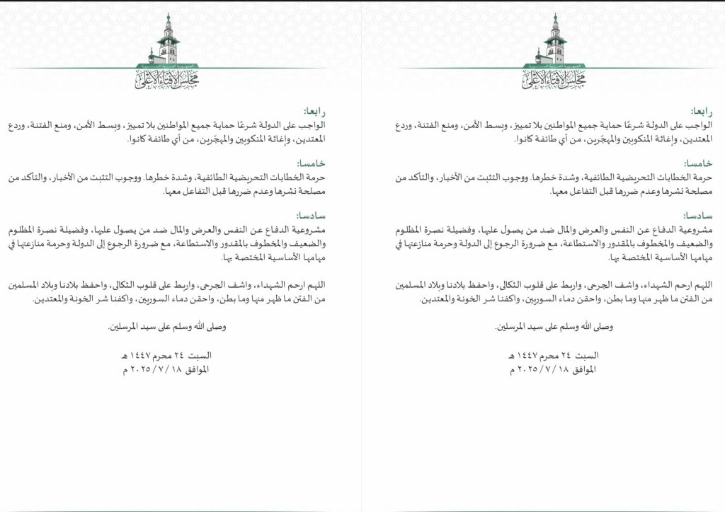 فتوى مجلس الإفتاء الأعلى في سوريا حول أحداث السويداء