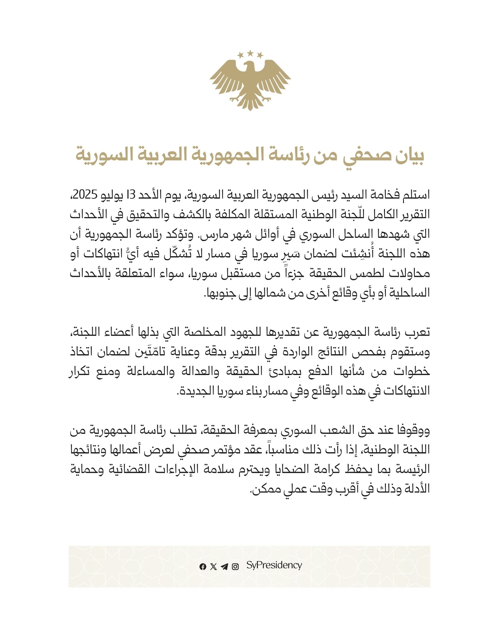 الشرع يستلم نتائج تحقيق الساحل و يقول إنه يمكن للجنة أن تكشف عن النتائج ” إذا رأت ذلك مناسباً ”