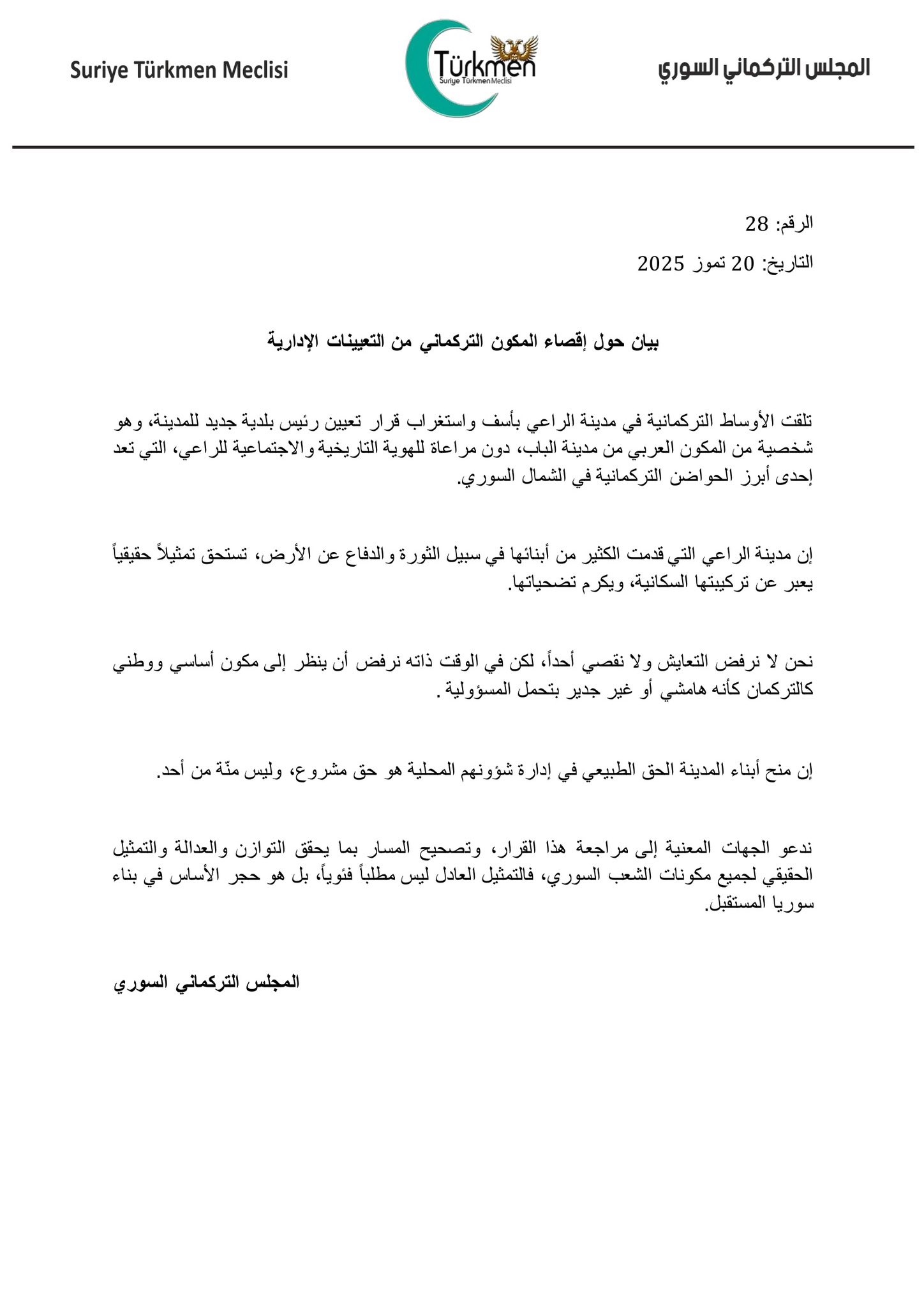 بيان للمجلس التركماني السوري حول ” إقصاء السلطات للمكون التركماني من التعيينات الإدارية “