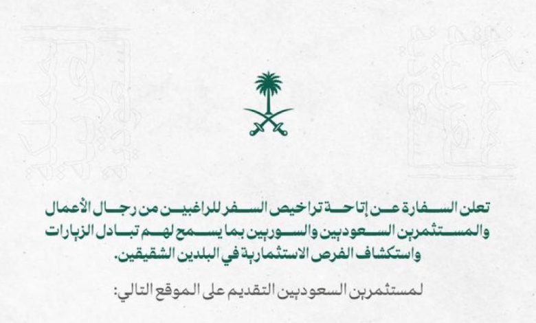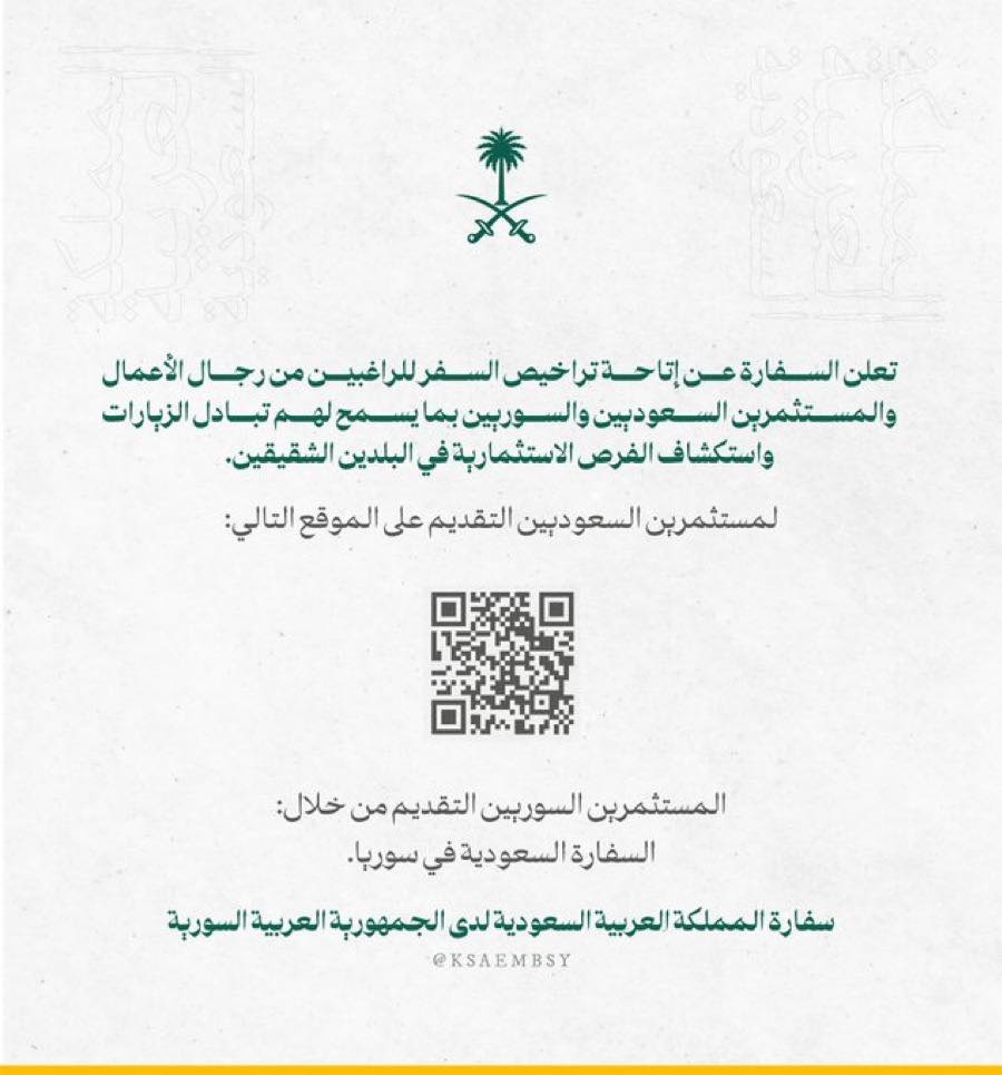 تركي آل الشيخ: ‏السعودية تسهل سفر المستثمرين السعوديين لسوريا.. ‏وفتحت اليوم تصاريح السفر لكل رجال الأعمال والمستثمرين من خلال الرابط المخصص لهذه التصاريح ، في خطوة تحفز فيها المملكة رجال الأعمال على اكتشاف الفرص ودعم الاقتصاد السوري بمشاريع نوعية.