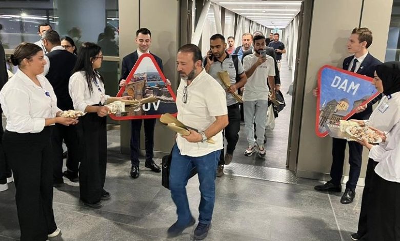 واستُقبلت الطائرة القادمة من سوريا بخراطيم المياه، وقُدّمت الزهور لطاقم الطائرة.
