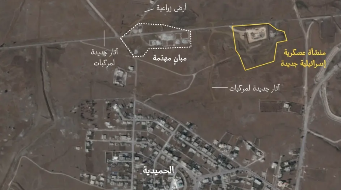 تؤكد الصور الملتقطة بالأقمار الصناعية فوق الحميدية أن بناء المنشأة العسكرية، التي تقع على بعد أقل من 500 متر شمال شرق القرية، بدأ بعد 1 يناير/كانون الثاني 2025.