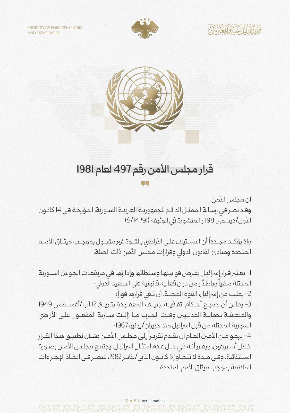 وأكد القرار حينها أن الجولان أرض سورية محتلة، وطالب إسرائيل بإلغاء قرارها فوراً، مشدداً على عدم شرعية أي إجراءات إسرائيلية لتغيير الوضع القانوني أو الإداري في المنطقة.