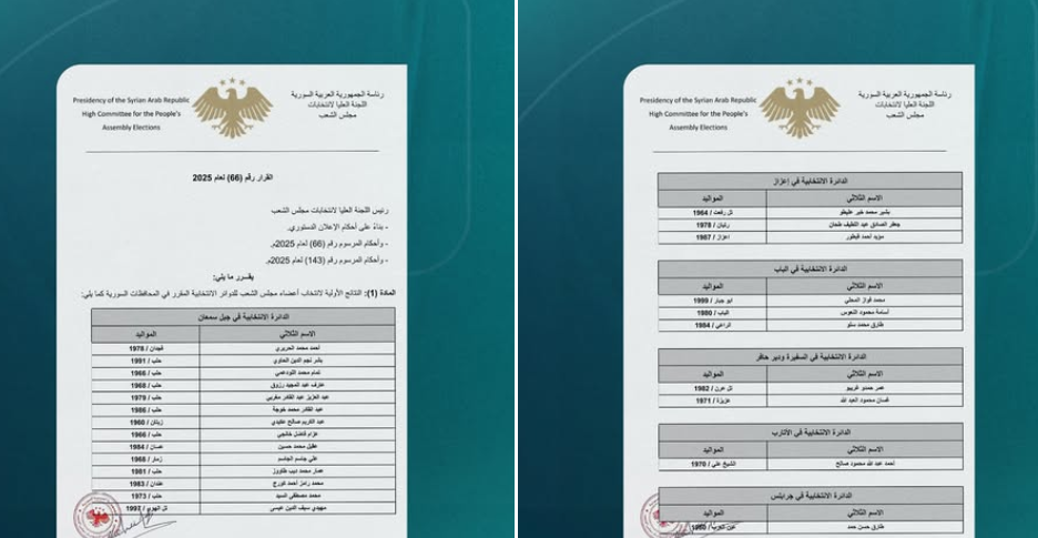بانتظار الثلث الذي سيعينه الشرع بشكل مباشر .. صدور النتائج الأولية لعملية تعيين أعضاء ” مجلس الشعب ” على يد ” الدوائر الانتخابية ” في المحافظات