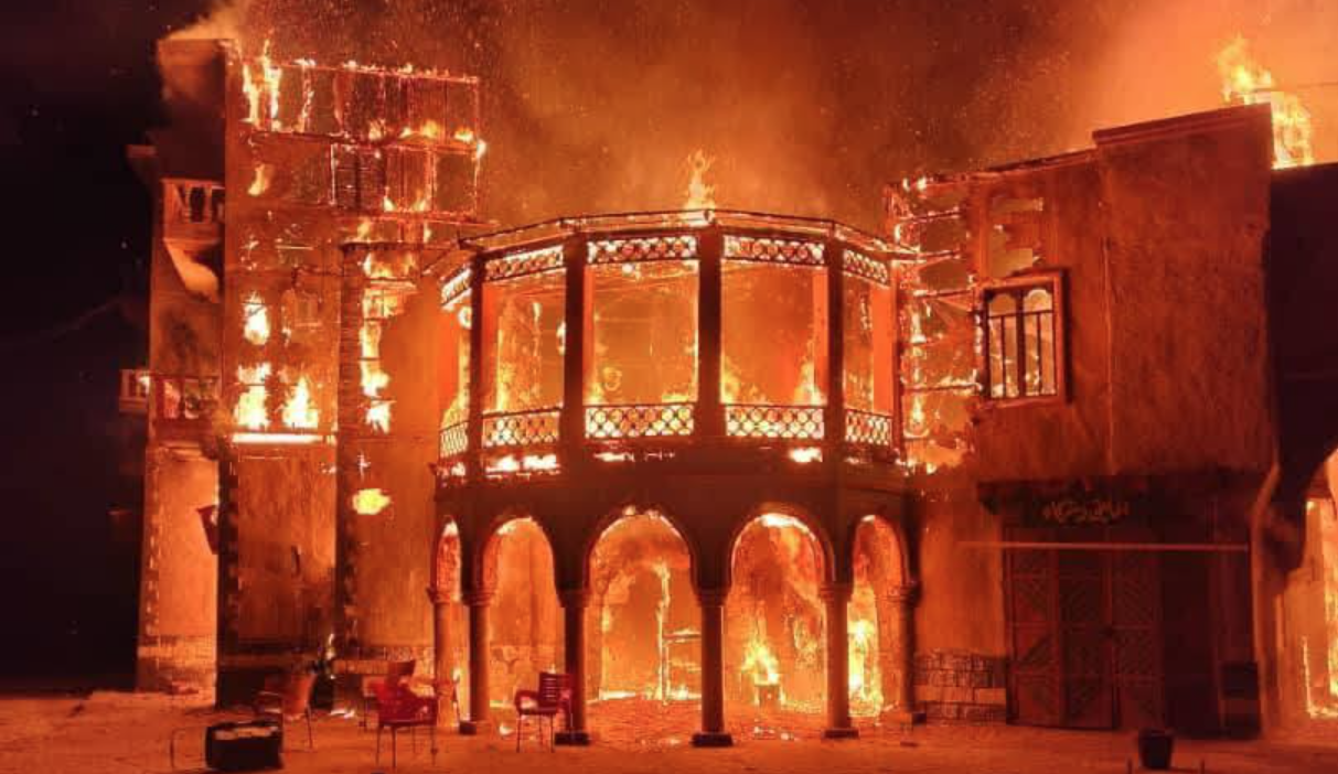 وشاركت شركة “غولدن لاين”، عبر حساباتها الرسمية على مواقع التواصل، مقطع فيديو وصورا للحريق، وعلقّت عليها ببيان جاء فيه: “مشاعر تختلط فيها الصدمة والخسارة، مع صلابة الإرادة والإيمان، والحمد على سلامة فريق العمل جميعاً، تعرضنا منتصف ليل أمس لجريمة غادرة ودنيئة، من تدبير أبناء ليل اتخذوا ظلامه جناحا لفعلتهم الوضيعة، إذ أحرقوا مدينة (النويلاتي) التي تم بناؤها بالحب، والجهد، والفن، والوقت، والمال، تاركين خنجرهم المسموم مغروزاً بوقاحة في قلب موقع التصوير”.