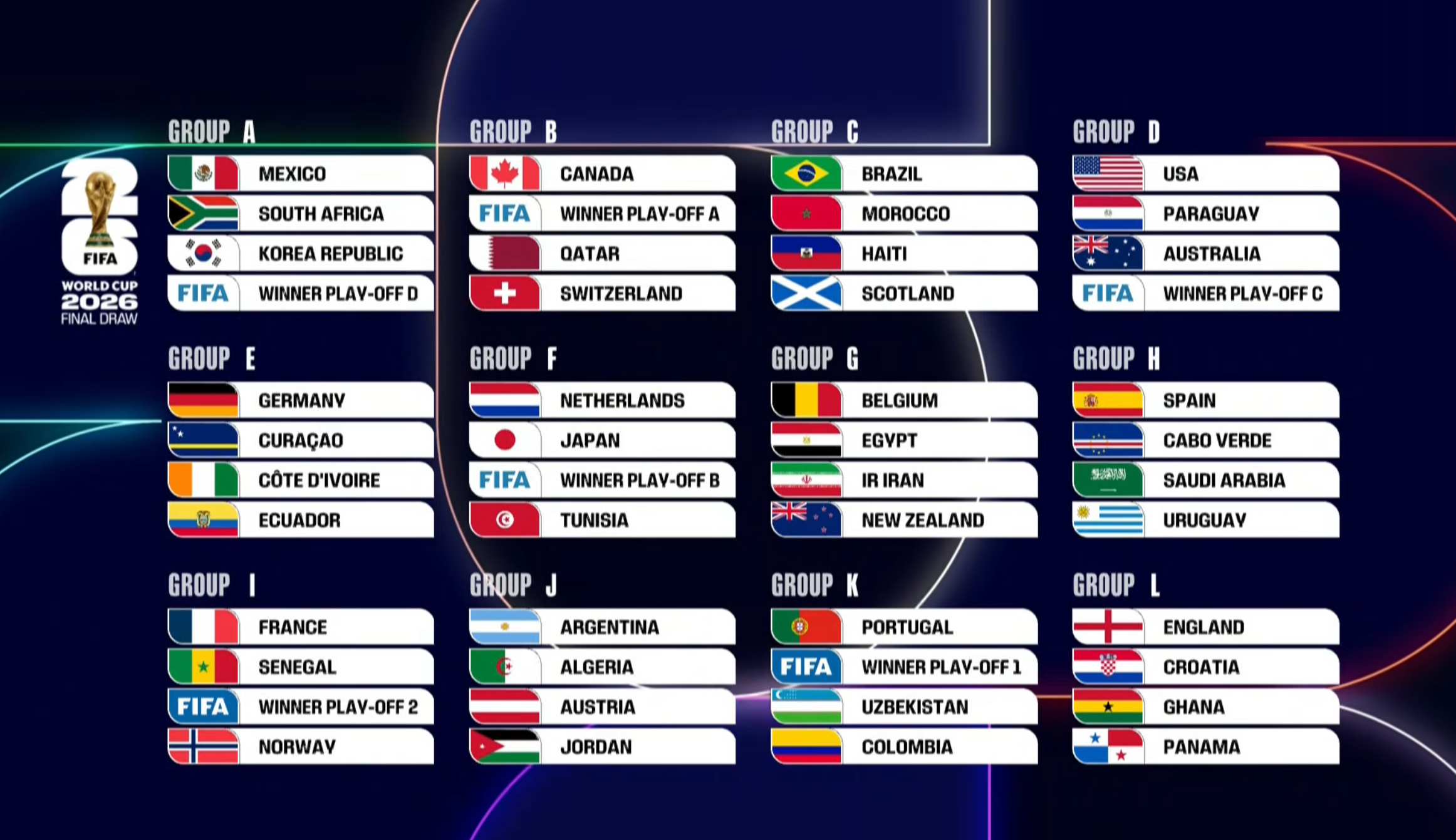 وتخوض قطر، التي استضافت نسخة 2022، منافسات المجموعة الثانية أمام كندا وسويسرا والفائز من مسار الملحق الأوروبي الذي يجمع إيطاليا/إيرلندا الشمالية وويلز/البوسنة والهرسك.