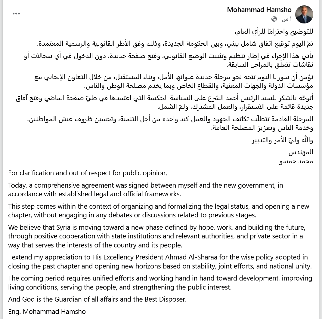وجاء في بيان نشره حمشو اليوم عبر حسابه في فيسبوك: للتوضيح واحترامًا للرأي العام، تمّ اليوم توقيع اتفاق شامل بيني، وبين الحكومة الجديدة، وذلك وفق الأطر القانونية والرسمية المعتمدة. يأتي هذا الإجراء في إطار تنظيم وتثبيت الوضع القانوني، وفتح صفحة جديدة، دون الدخول في أي سجالات أو نقاشات تتعلّق بالمراحل السابقة. نؤمن أن سوريا اليوم تتجه نحو مرحلة جديدة عنوانها الأمل، وبناء المستقبل، من خلال التعاون الإيجابي مع مؤسسات الدولة والجهات المعنية، والقطاع الخاص وبما يخدم مصلحة الوطن والناس. أتوجّه بالشكر للسيد الرئيس أحمد الشرع على السياسة الحكيمة التي اعتمدها في طيّ صفحة الماضي وفتح آفاق جديدة قائمة على الاستقرار، والعمل المشترك، ولمّ الشمل. المرحلة القادمة تتطلّب تكاتف الجهود والعمل كيدٍ واحدة من أجل التنمية، وتحسين ظروف عيش المواطنين، وخدمة الناس وتعزيز المصلحة العامة”.