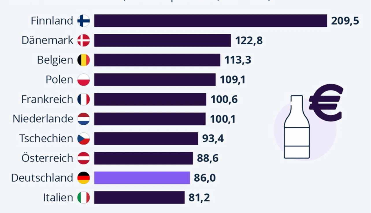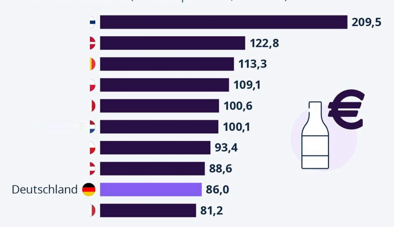 كما أوضحت الإحصاءات أن الكحول أغلى نسبيًا في عدد من الدول المجاورة لألمانيا؛ إذ تزيد الأسعار في الدنمارك بنسبة 23% عن المتوسط الأوروبي، وفي بلجيكا بنسبة 13%، وفي بولندا بنسبة 9%.