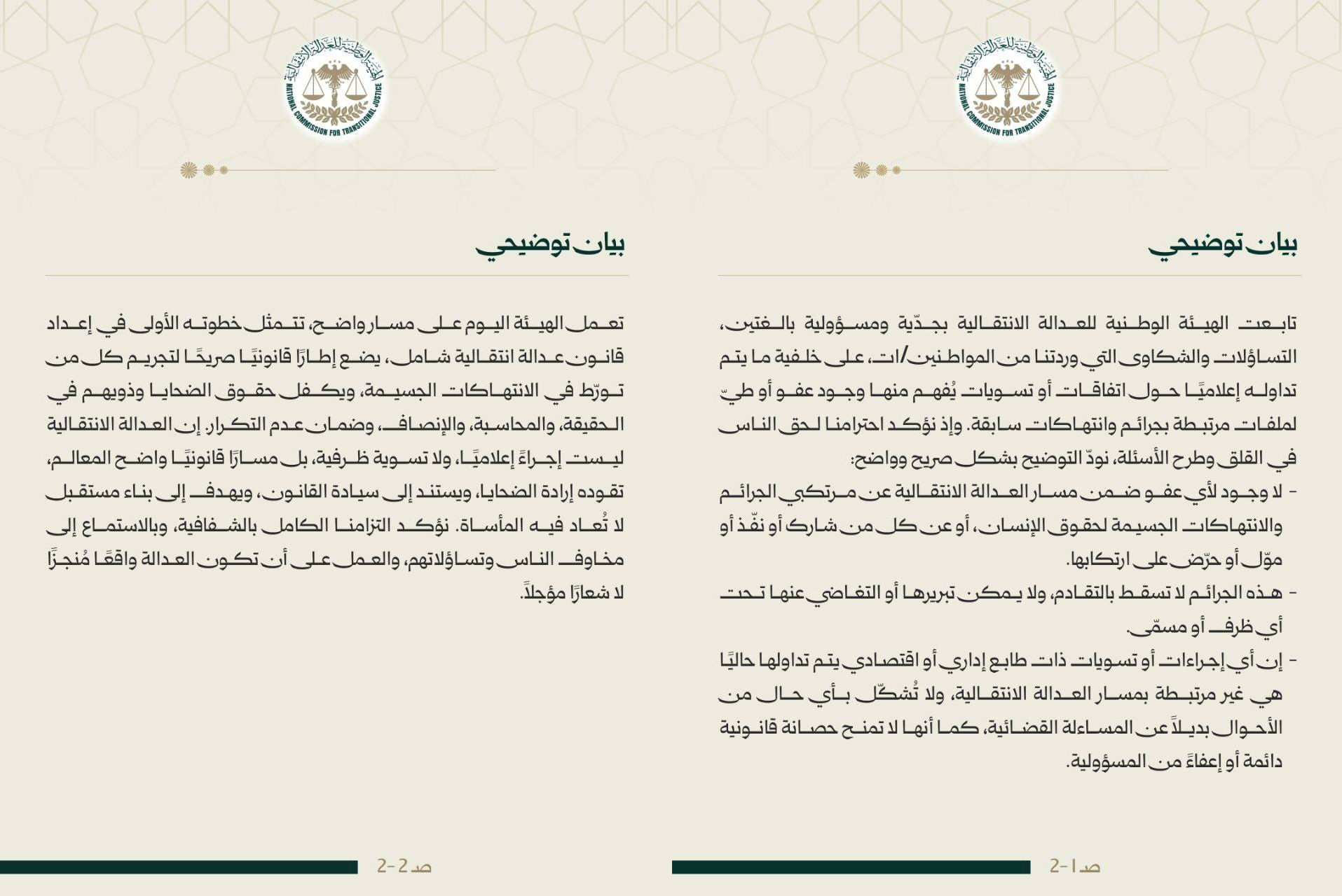 بيان للهيئة الوطنية للعدالة الانتقالية بعد بيان تسوية محمد حمشو