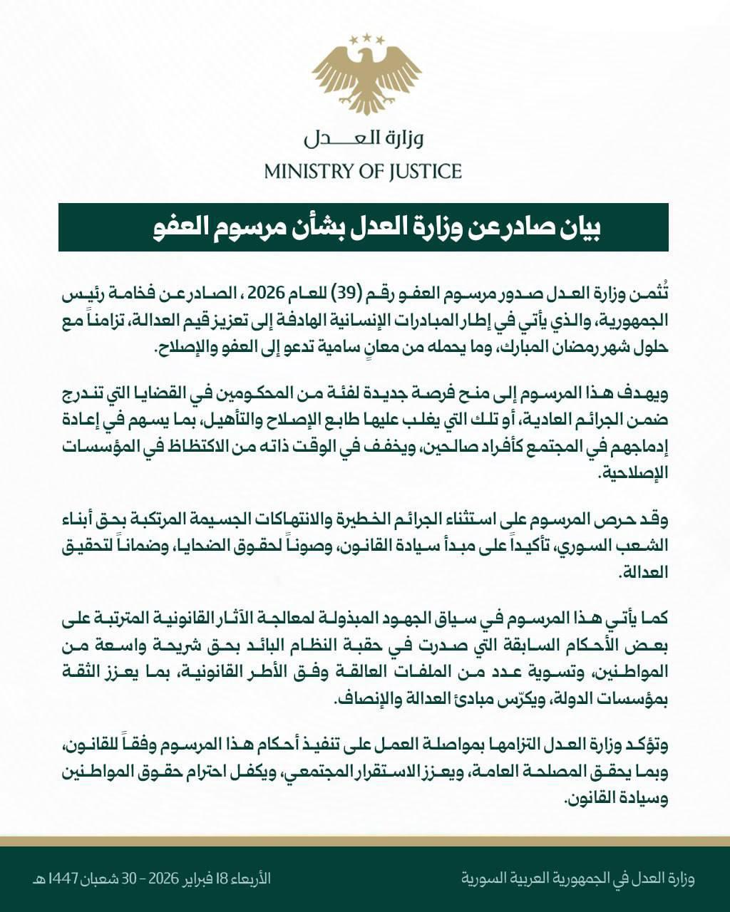 مرسوم عفو عام من الشرع .. و وزارة العدل تعلق