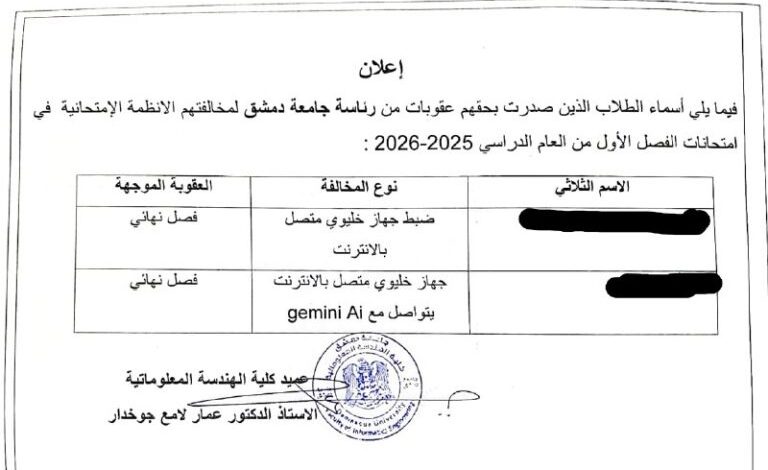 ضجت صفحات التواصل الاجتماعي بقرار فصل طالب جامعي في كلية الهندسة المعلوماتية فصلاً نهائياً لاستخدامه “الجهاز الخلوي “الذكاء للاصطناعي Gemini” وذلك الصفحة الرسمية للكلية.