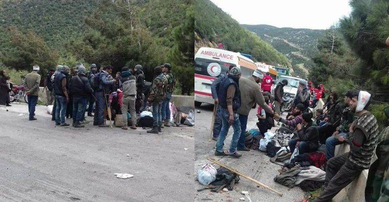 وذكر ناشطون أن إحدى قوافل الحافلات التي تقل المهجرين، اصطدمت بشاحنة خضار في منطقة التميزة في سهل الغاب.
