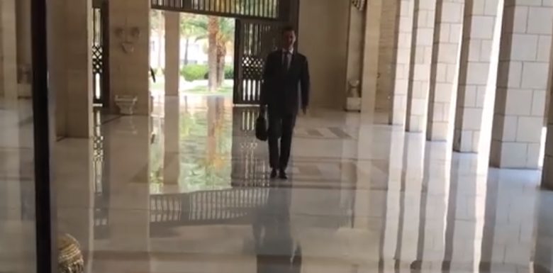 وظهر الأسد في الفيديو وهو يرتدي بذلة ورابطة عنق ويحمل حقيبة أوراق ويسير في مدخل رخامي بأحد المباني.