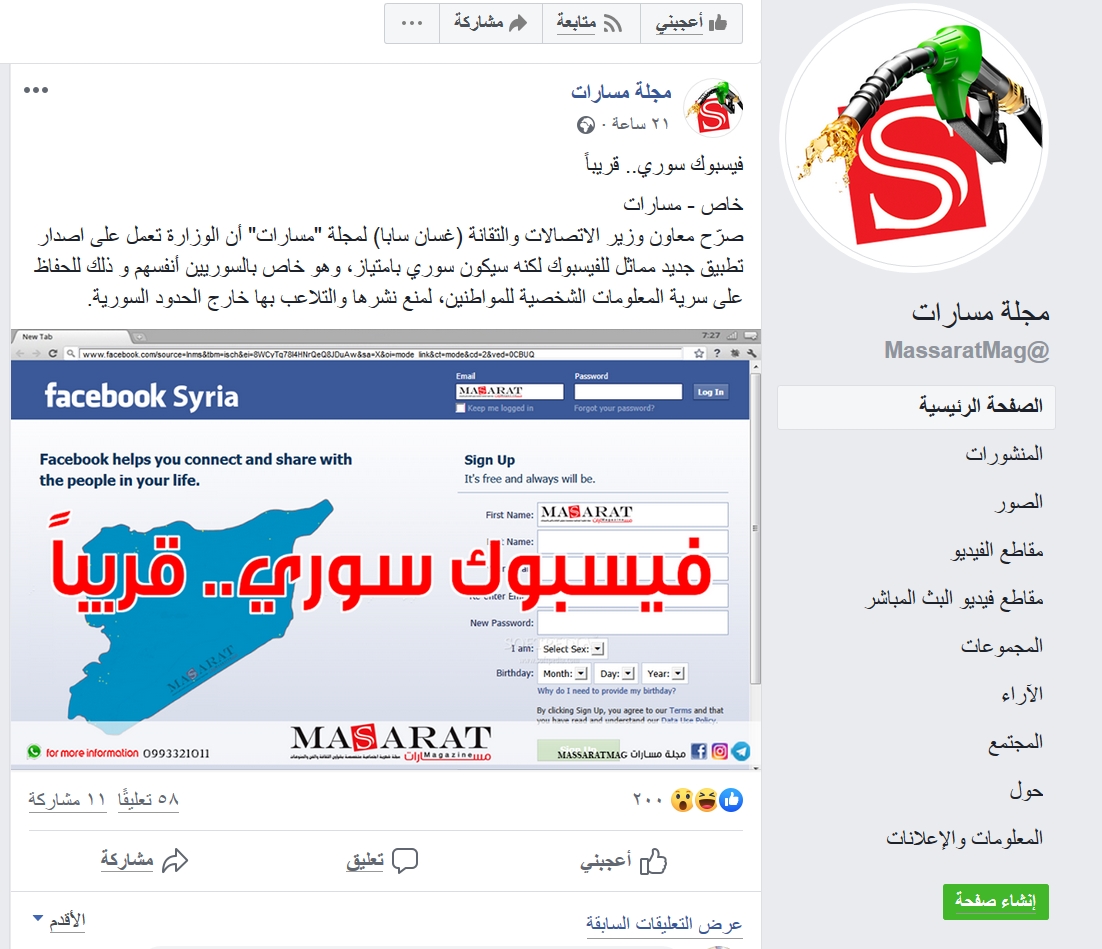 وقالت صفحة على فيسبوك تطلق على نفسه اسم “مجلة مسارات”، إن نائب وزير الاتصالات والتقانة، غسان سابا، صرح لها أن الوزارة “تعمل على إصدار تطبيق جديد مماثل للفيسبوك لكنه سيكون سوري بامتياز”.