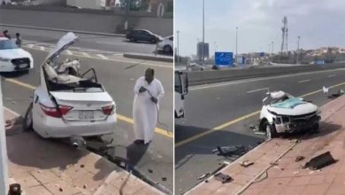 سعودي يقف مذهولاً أمام سيارته التي انشطرت إلى نصفين ( فيديو )