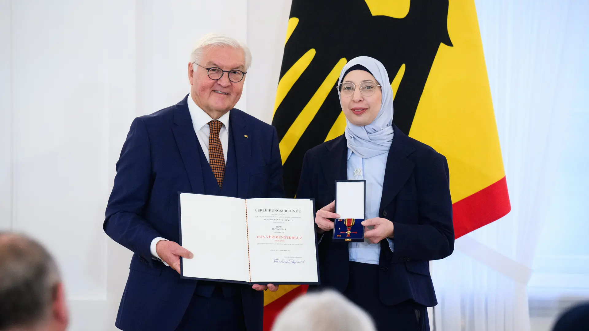 حصلت السيدة الألمانية السورية دعاء زيتون على وسام الاستحقاق الألماني، يوم الاثنين، خلال فعالية شهدت تكريم 19 شخصاً بهذا الوسام.…