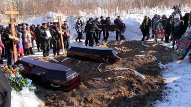 حضر العشرات جنازة يوم الجمعة في مدينة بيرم الروسية لثلاثة من ضباط الشرطة لقوا حتفهم خلال ما يسميه الكرملين “العملية…