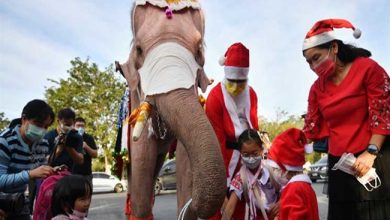 أفيال ترتدي ملابس ” بابا نويل ” و توزع الكمامات على تلاميذ مدرسة في تايلاند