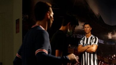 يرتدي تمثال الشمع لنجم كرة القدم البرتغالي كريستيانو رونالدو قميص ناديه السابق يوفنتوس، في متحف “مدام توسو” في دبي، بينما…