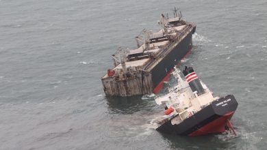 انشطار سفينة عملاقة إثر جنوحها شمالي اليابان ( فيديو )